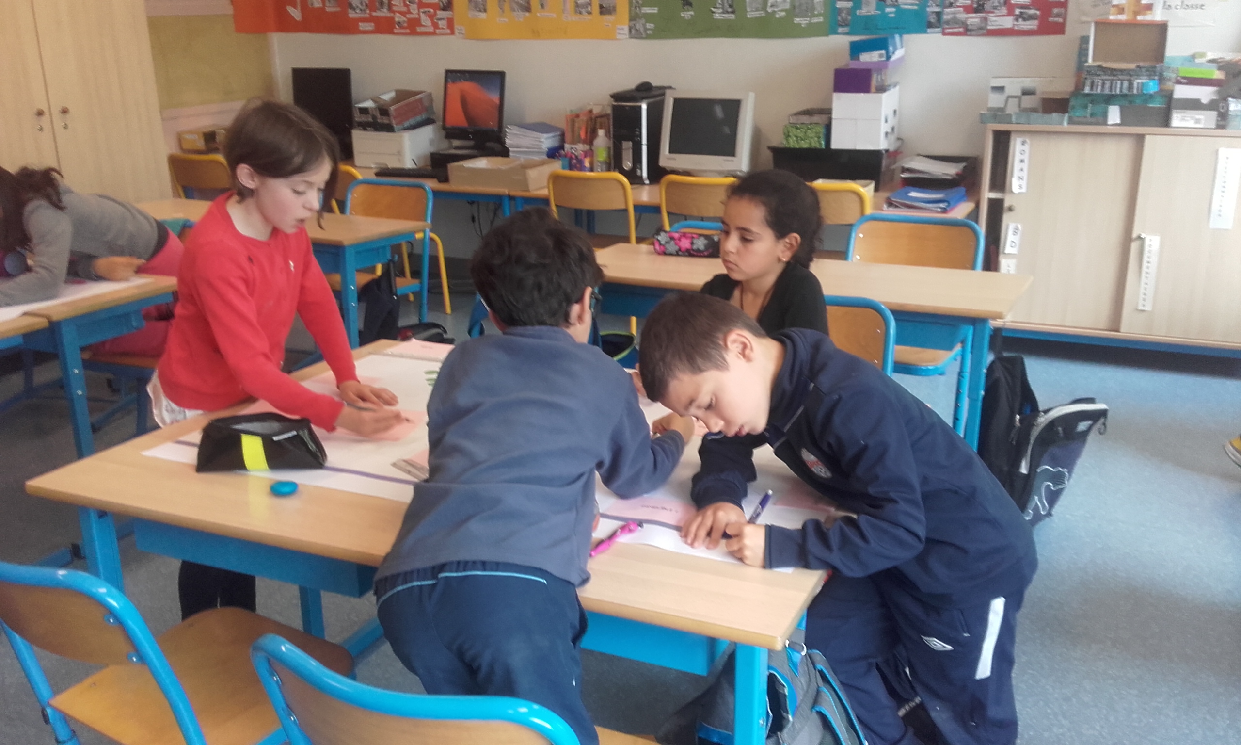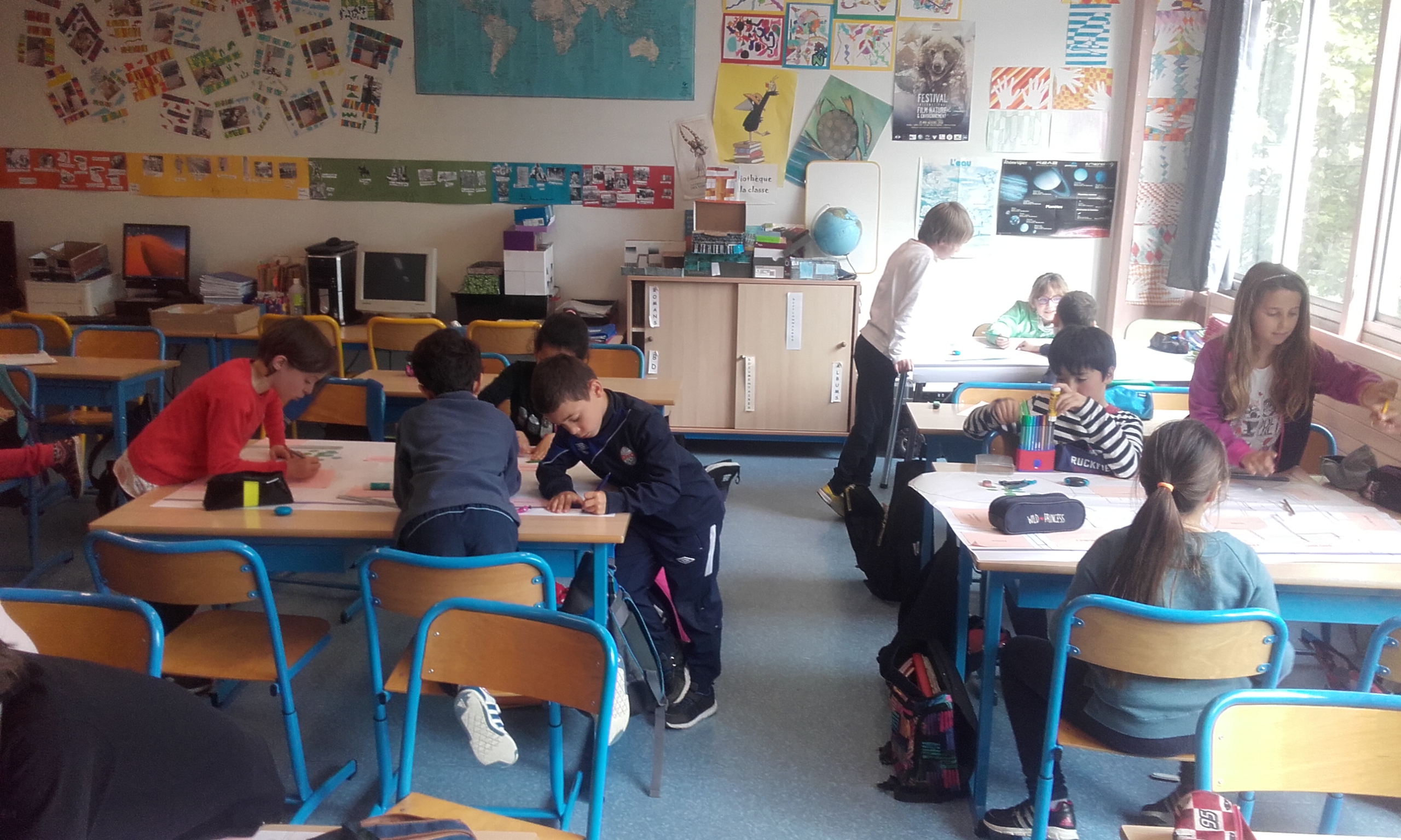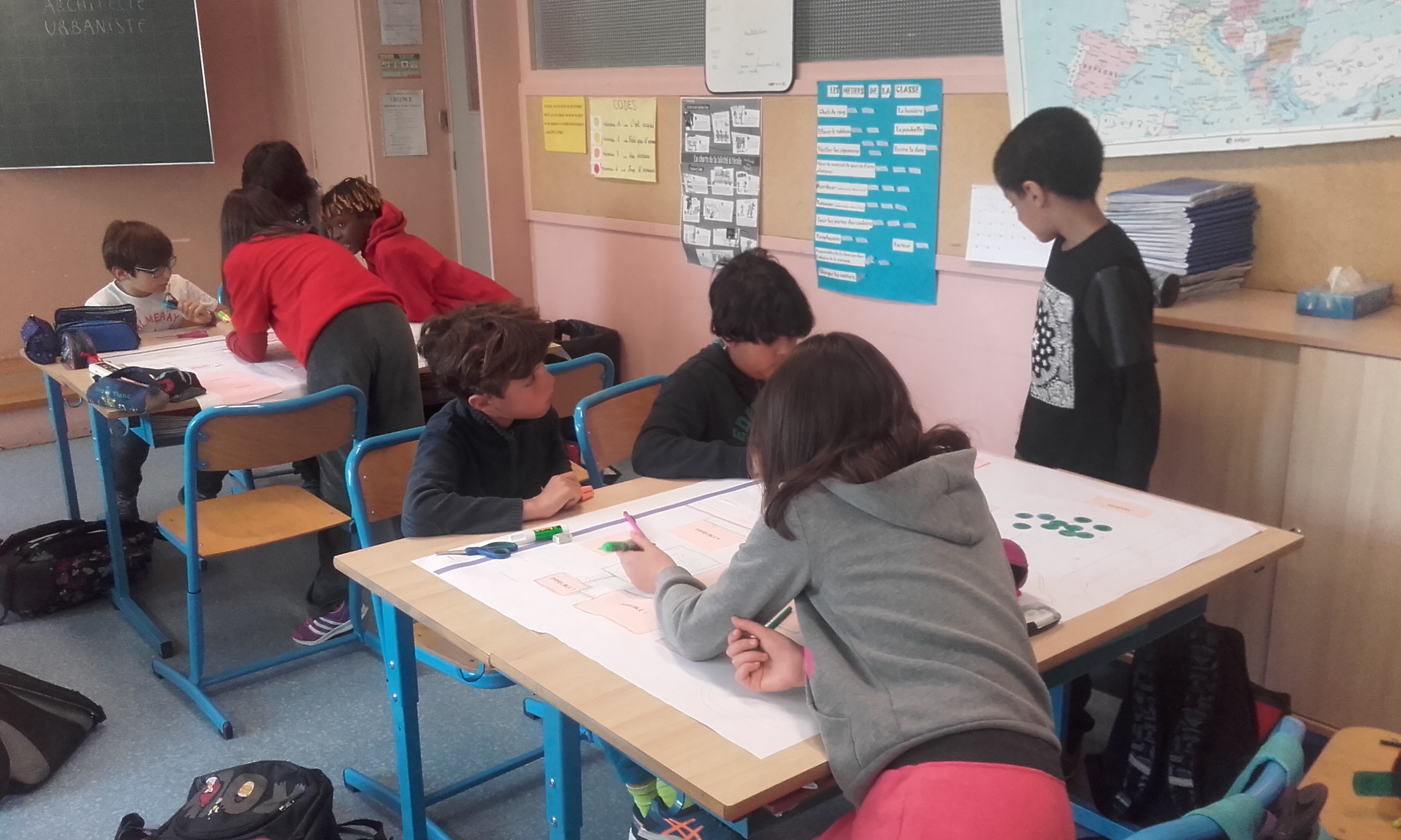 Puis nous avons fait des affiches pour représenter un éco-quartier. Nous nous sommes transformés en urbanistes. Ensuite nous avons voté pour la meilleure des affiches et c'est l'éco-quartier de la paix qui a gagné.