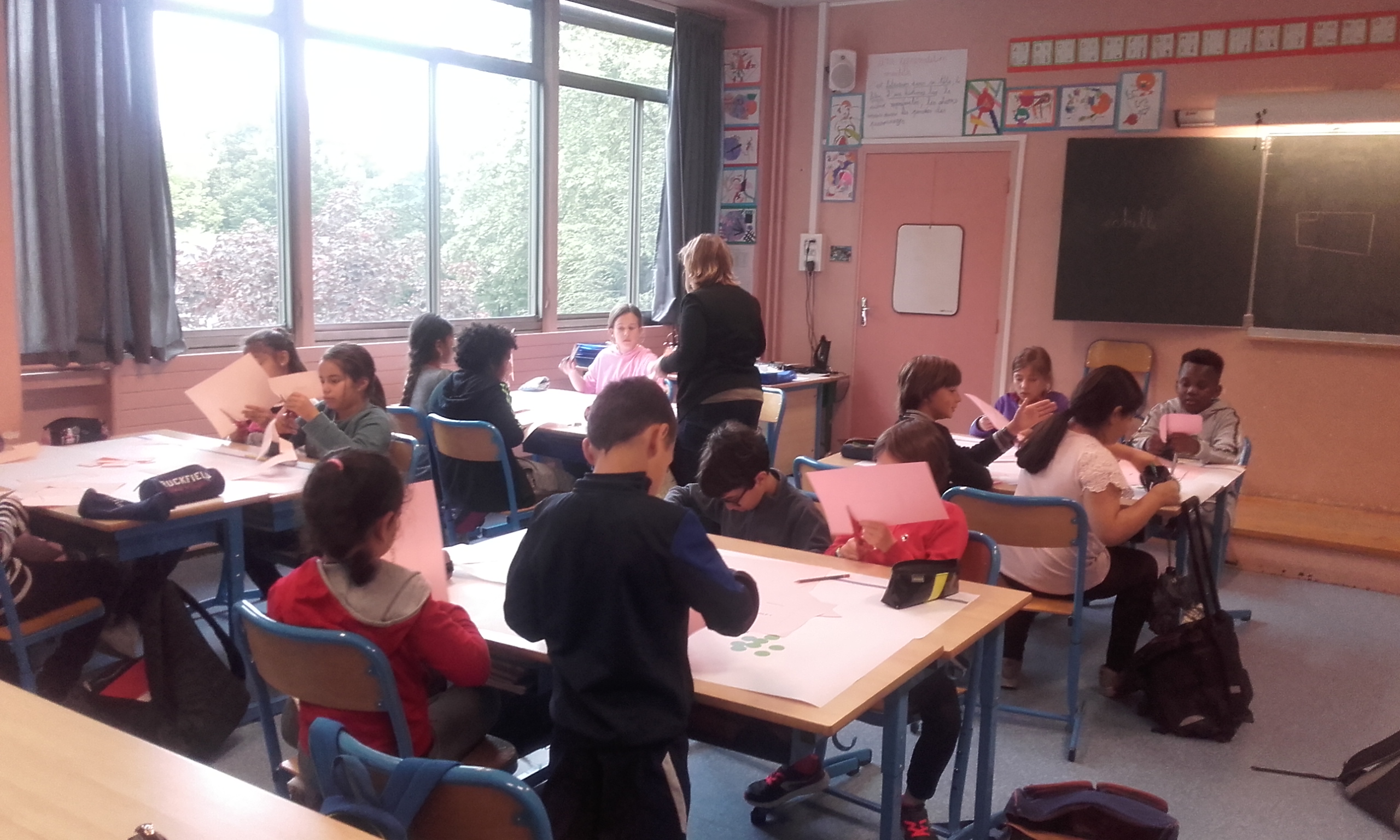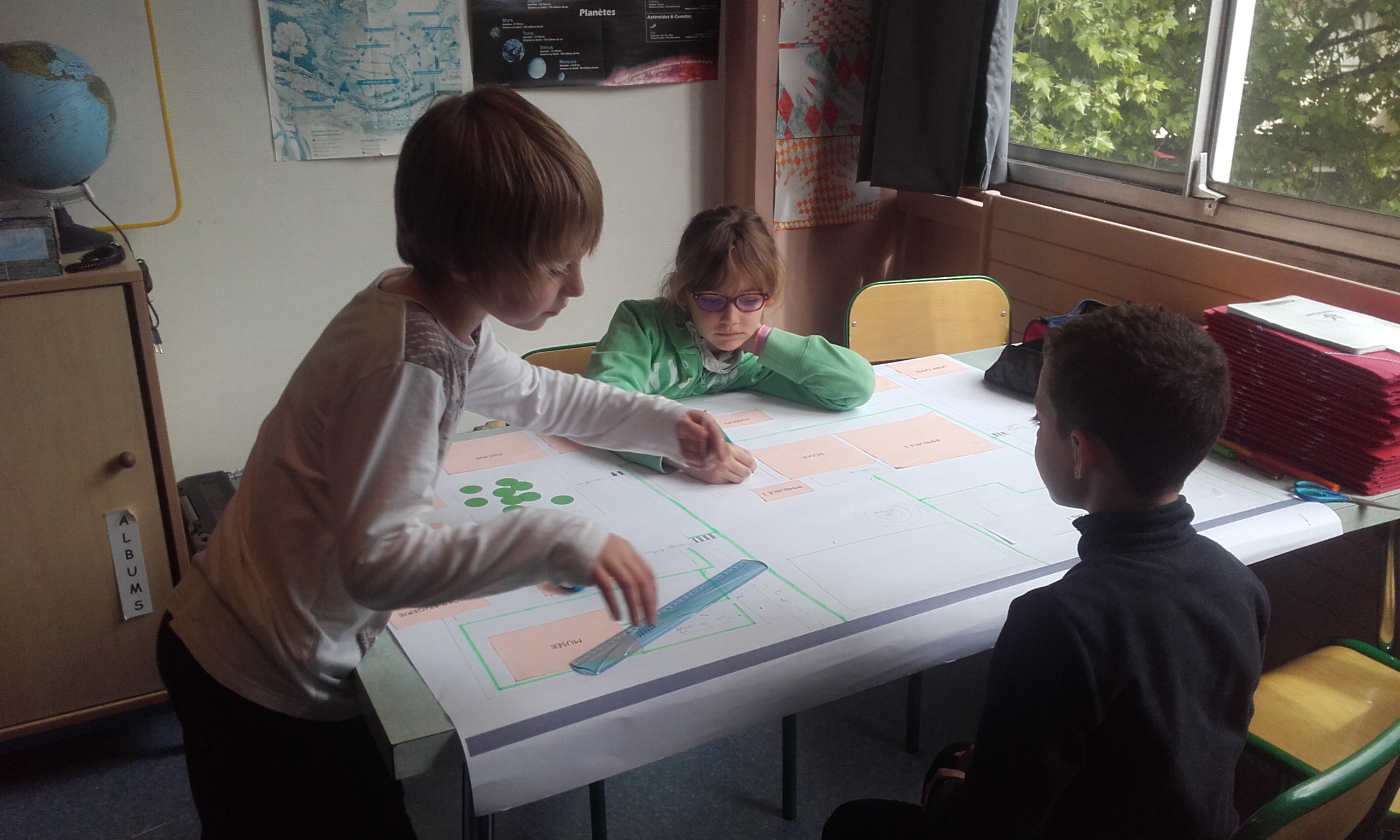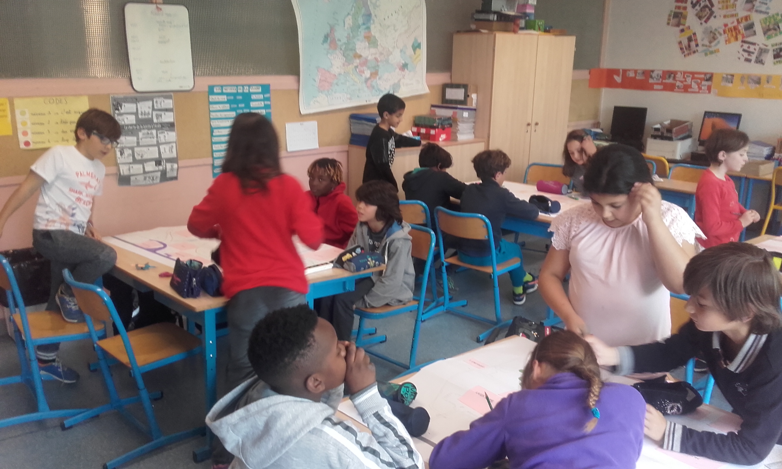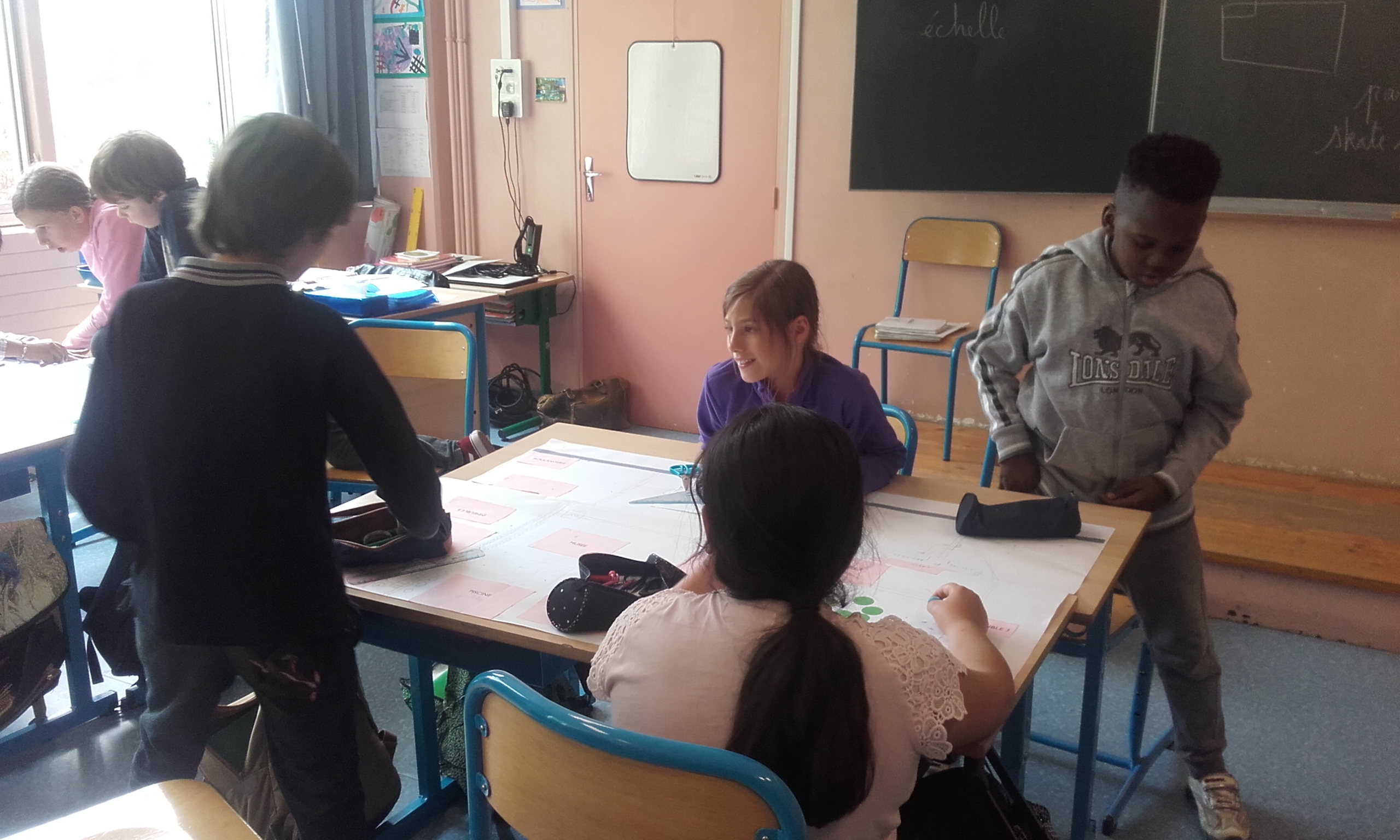 Puis nous avons fait des affiches pour représenter un éco-quartier. Nous nous sommes transformés en urbanistes. Ensuite nous avons voté pour la meilleure des affiches et c'est l'éco-quartier de la paix qui a gagné.