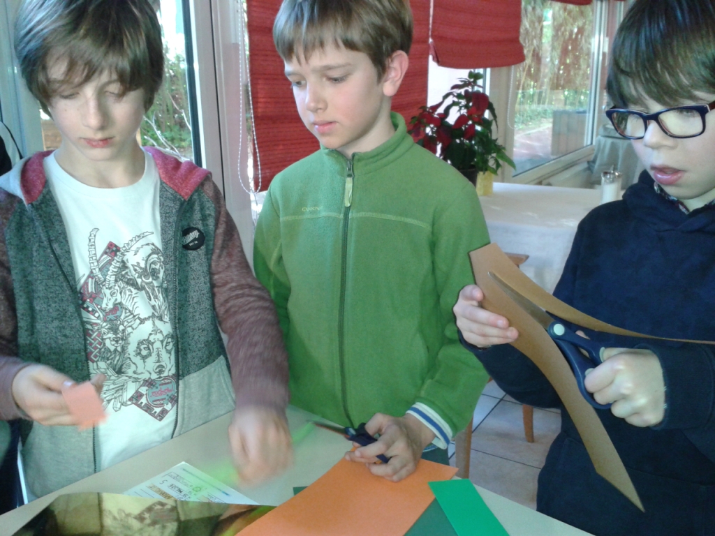 Lors de leur première visite les enfants collèrent, découpèrent et trièrent, avec les résidents, des morceaux de papiers et de tissus colorés afin de réaliser ensemble un tableau.