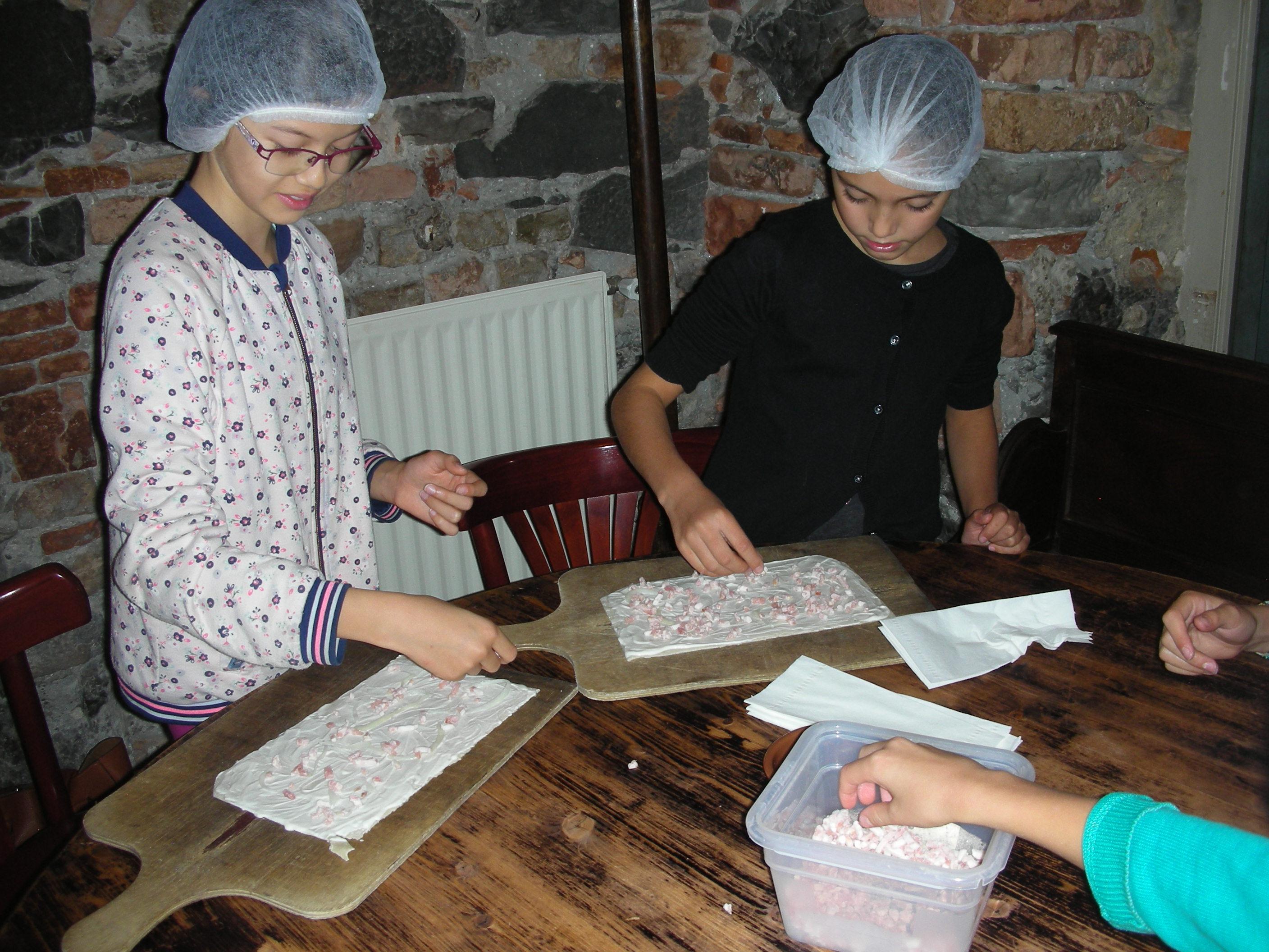Il avait déjà fait la pâte parce que l’on n'avait pas eu assez de temps pour la faire. Sur la pâte il y avait une sauce au fromage et à la noix de muscade... mais on sentait surtout la noix de muscade. Dès que l’on a commencé, le monsieur nous a dit d'aller nous laver les mains et de mettre des charlottes pour ne pas faire de jaloux. Nous avons étalé la sauce sur la pâte, puis on a mis des lardons, des oignons, du fromage et on a tout fait cuire. Avant la cuisson le monsieur a découpé nos Flammekuches.