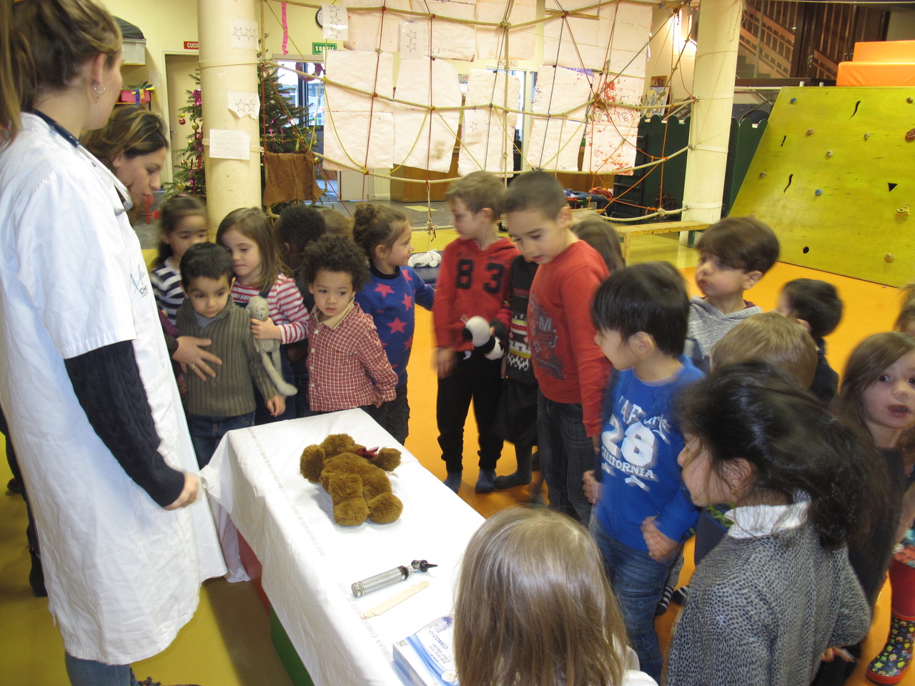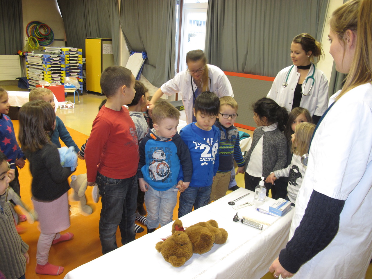 Après chaque présentation, les enfants ont pu faire soigner leurs doudous et se familiariser avec le matériel médical présenté. Il on pu écouter le cœur des étudiantes avec leur stéthoscope