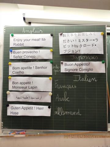 Mercredi 25 mars, des parents d'élèves ainsi que les adultes travaillant à l'école sont venus en classe pour lire aux CP l'album : Bon appétit petit lapin dans plusieurs langues, arabe, anglais, portugais, allemand, italien, espagnol et même japonais !